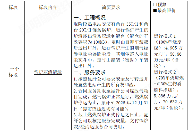 3.2交貨期: 服務(wù)期限至昆纖公司煤改氣項(xiàng)目完成,燃?xì)忮仩t正常運(yùn)行,燃煤鍋爐停運(yùn)為止,預(yù)計至2026年12月31日(提前或延遲均有可能)。